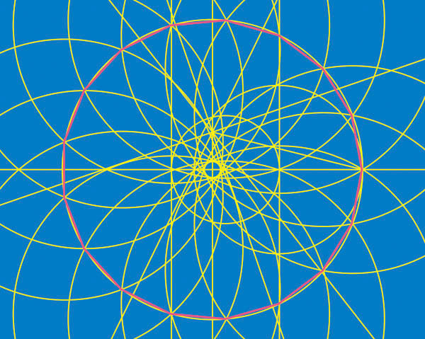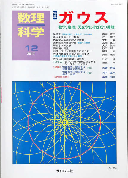 特集のガウスにちなみ,正十七角形の作図手順を絵にしています.これはコンパス(円)と定規(直線)のみによって描かれています.この作図可能性には群や体といった代数的な構造が関係しています .
