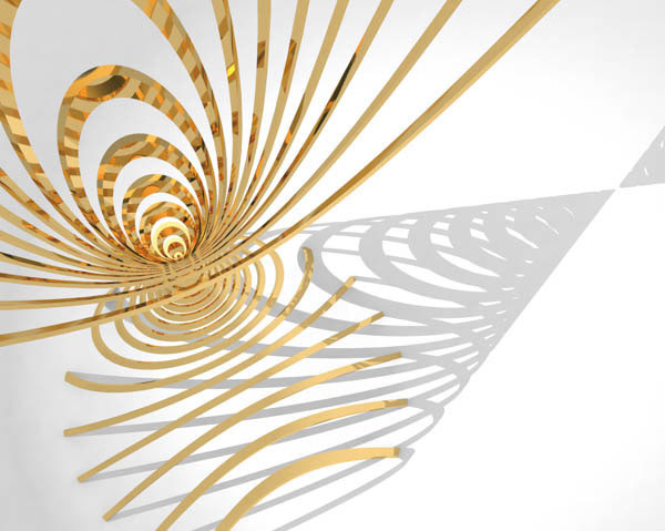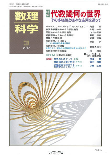 今月号の特集である代数幾何にちなみ,円錐曲線をモチーフにしています.円錐曲線は円錐を平面で切断した時の断面から得られる曲線であり,放物線や楕円など 2 次方程式で定義される代数幾何的な図形です.代数幾何学では「かたちの影」を観察することがしばしば重要ですが,この絵では 3D CAD ソフト内で光を仮想的に当て,影を作っています.