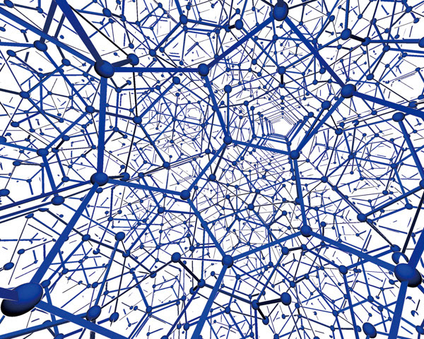 今回の表紙では正十二面体の頂点どうしをつないで 3 次元空間全体に配置し,その辺と頂点を描いています.正十二面体だけでは空間は充填できないため,隙間のある充填となっています.