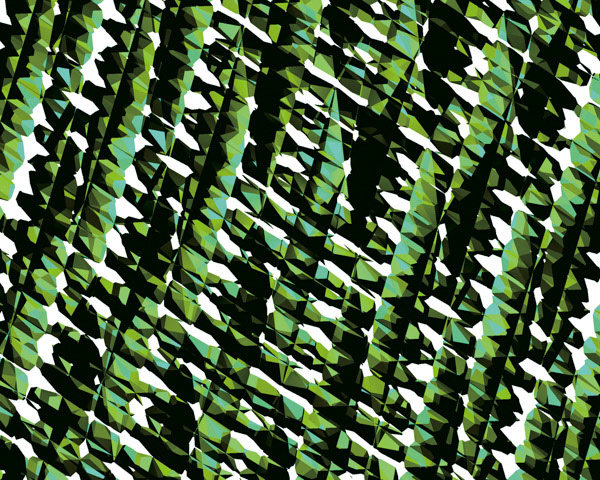 今回の表紙では,3次元の多面体を格子上に並べ,それを超平面切断した切断面を描いています.ここでは3次元空間内の拡散反射を使い,陰影をつけています.
