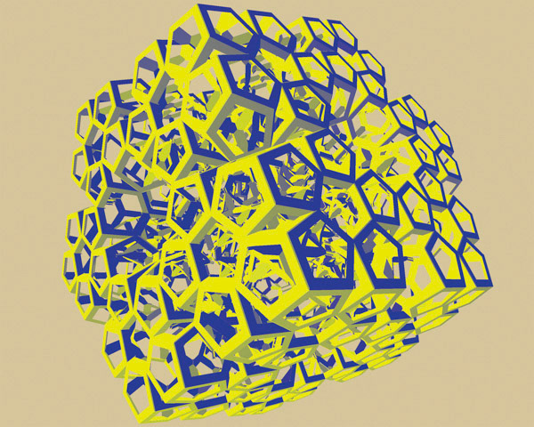 今回の表紙では,正十二面体を縮小させながら再帰的に配置した図形をレンダリングしています.これはシェルピンスキーのギャスケットを3次元に拡張して構成しました.