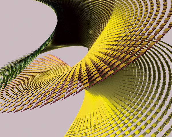 極小曲面であるカテノイドとヘリコイドは,滑らかな変形によって移りあうことが知られています.今回の表紙では,その変形によって生成した曲面上にパネルを配置し,パラメータ変数に応じて回転させながら色をつけています.