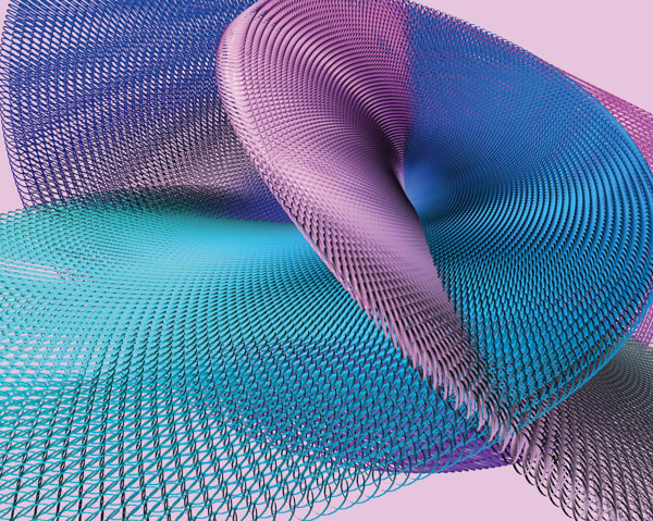 今回の表紙画像ではエンネパー曲面をもとにしています.エンネパー曲面は自己交差を持つ極小曲面として知られていますが,円筒を曲面上に配置し,それをパラメータ変数の値に従って回転させ,さらに色変換を施しています.
