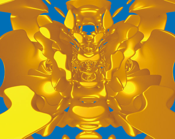 3 次元空間はステレオ射影によって 4 次元空間内の球面に対応させることができます.それを四元数に対応させて代数演算を施し,さらにノイズ関数の値をとれば,3 次元空間上のゆらぎのあるスカラー場をつくることができます.このスカラー場の等値面をとって,曲面を生成しています.