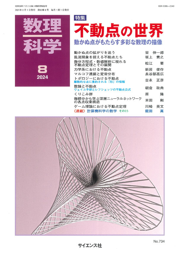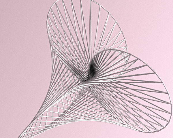Hopf 束は 3 次元球面から 2 次元球面への写像によって得られる,円周をファイバーとするファイバー束です.これによって,2 次元球面上の軌道から 3 次元球面上の円周の変形族が得られます.さらに 3 次元球面を四元数と見なせば,四元数の演算によって 3 次元球面上の変換が得られます.今回の表紙では,このようにして得られた円周の変形族をつないでモデリングしました.