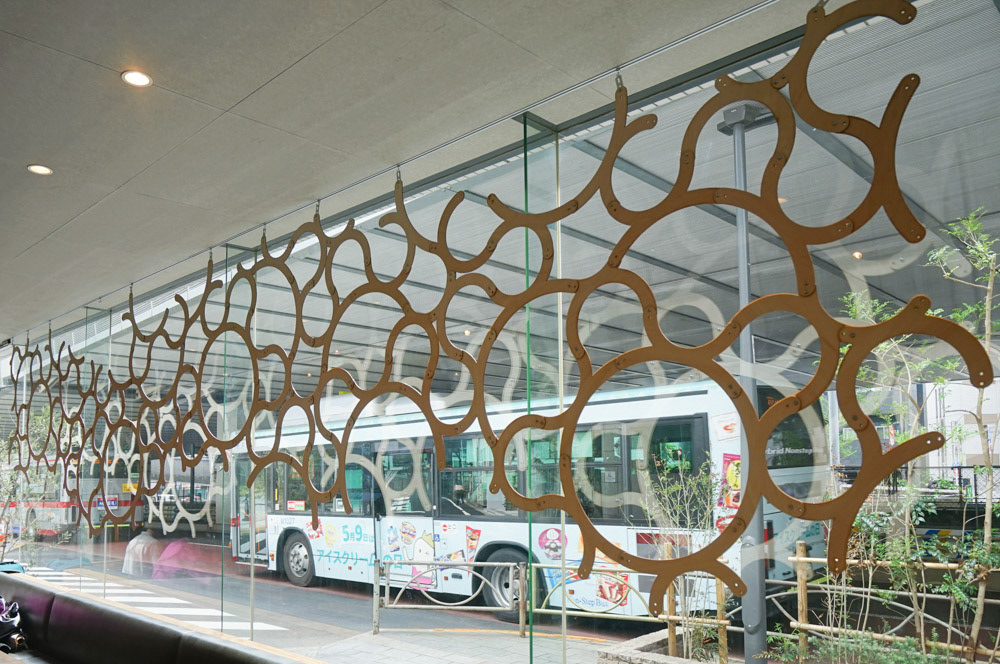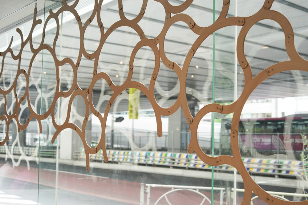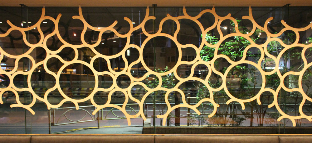 This pattern is made from Penrose tiling, which is constructed by 2 kinds of parts. Exhibition at FabCafe Tokyo in April 2019.